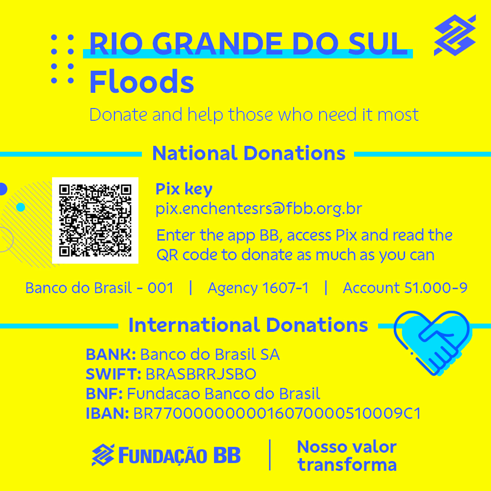 O Banco do Brasil e a Fundação BB lançaram campanha para prestar auxílio às pessoas diretamente afetadas pelas enchentes no Rio Grande do Sul. As doações voluntárias serão somadas ao montante que será doado pela Fundação BB. A sua participação é essencial para ampliar o impacto social positivo e ajudar as comunidades afetadas.